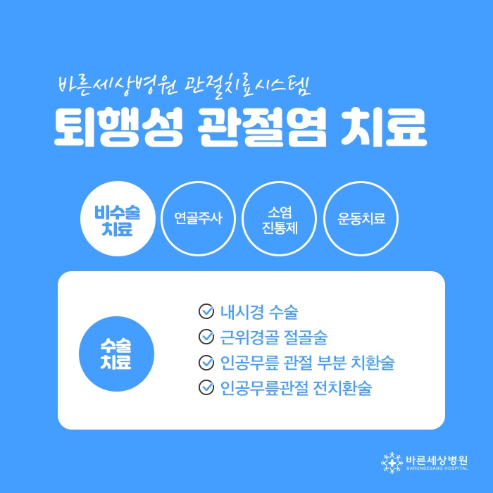 관절염이 많이 진행되지 않은 상태에서 회복할 수 있는 방법을 적용하게 된다면 소염진통제, 주사 요법, 운동 등의 방법으로 증상이 호전되는 것을 기대할 수 있습니다. 지속적으로 보존적인 방법을 적용하여 증상이 호전되는 것을 확인할 수 있는데요. 만일 지속적으로 방법을 적용해도 증상이 완화되는 효과를 느끼지 못하고 통증이 그대로 나타나게 된다면 수술적인 방법을 적용하여 증상을 회복할 수 있도록 해야 합니다. 내시경 수술, 근위경골 절골술, 인공무릎관절 등 다양한 방법으로 적용할 수 있기 때문에 꼼꼼하게 증상을 파악하고 충분한 상담 후에 진행해야 합니다.