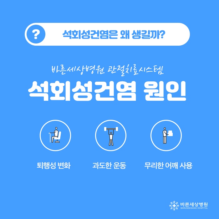 석회화건염이 발생하는 뚜렷한 원인을 아직 알려지지 않았지만 대부분 발생하는 원인은 퇴행성으로 인하여 힘줄 세포가 괴사 하며 어깨 조식에 석회질이 침착하면서 발생하게 됩니다. 또한 힘줄로 연결되는 혈액이 원활하게 공급되지 않고 줄어들게 되어 산소 분압이 저하되면서 힘줄 세포가 연골 세포로 변해 석회질이 침착되어 이런 원인으로 증상이 발생할 수 있습니다.