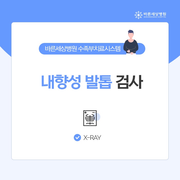내성발톱병원에서는 개인의 상태와 내성발톱의 변형 정도를 확인하기 위해서 X-ray 검사를 진행하고 있습니다. 단계에 따라서 증상과 완화할 수 있는 방법이 달라지기 때문에 꼭 개인의 상태를 확인할 수 있는 방법을 통해서 증상을 검사하고 회복할 수 있도록 계획을 세워 보시길 바랍니다. 완화할 수 있는 방법을 적용할 때에는 충분한 이야기 후 진행하고 있습니다.