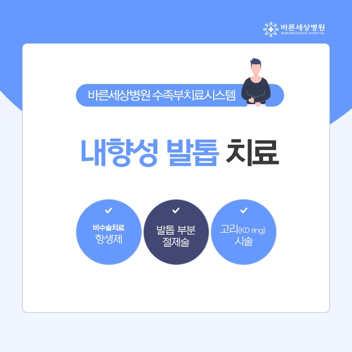 염증이 심하지 않고 초기 단계라면 항생제 치료와 함께 소독을 진행하여 완화할 수 있도록 적용하게 됩니다. 변형 정도와 통증, 염증이 심한 경우라면 국소마취 후에 발톱 뿌리까지 발톱을 절제하는 발톱 부분 절제술을 시행할 수 있습니다. 이때 염증 때문에 커진 연부 조직을 필요하다면 제거를 해야 합니다. 그 외에도 KD ring 시술을 진행할 수 있습니다.